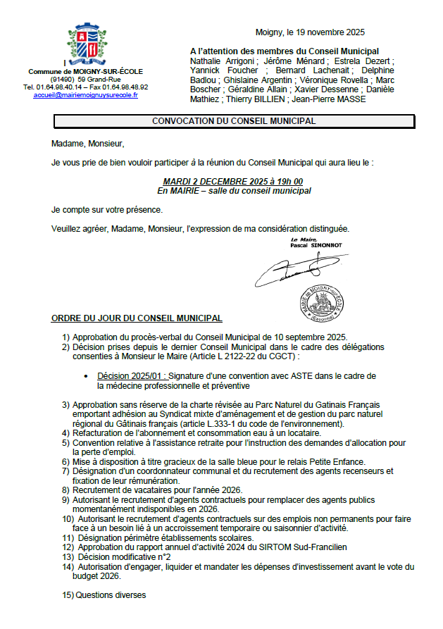 Convocation du Conseil Municipal – Mardi 2 décembre 2025